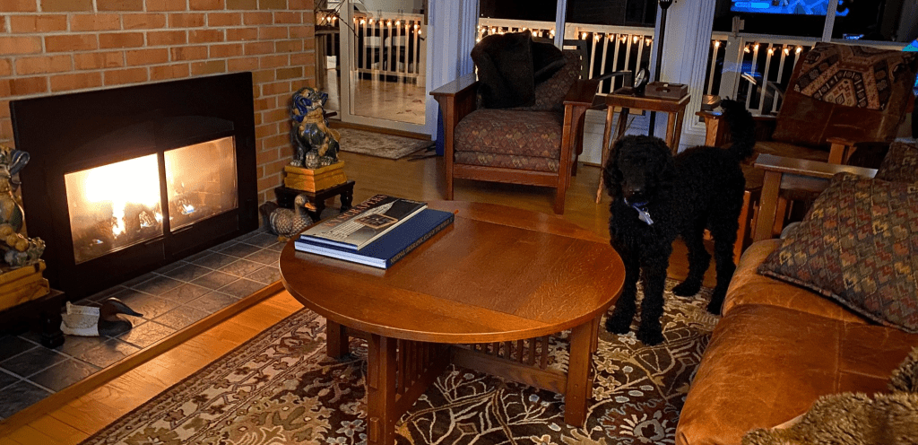We visited Kiki’s parents so she could use their Internet for her boring work meeting. When we came home in the evening Kiki tried to get me to post in front of the fire, but I would get no closer than you see in this picture. She wonders if I am afraid of fire?
