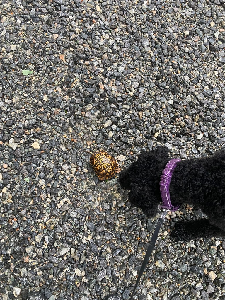 My morning walks were a little damp, but still fun. I got to play with a toad (me-pounce with both feet; toad-hop; me-jump back in surprise; repeat). I also saw many turtles. I find them confusing. Kiki would not let me chase a deer. I also watched Kiki make gazpacho. Maybe she will share later?