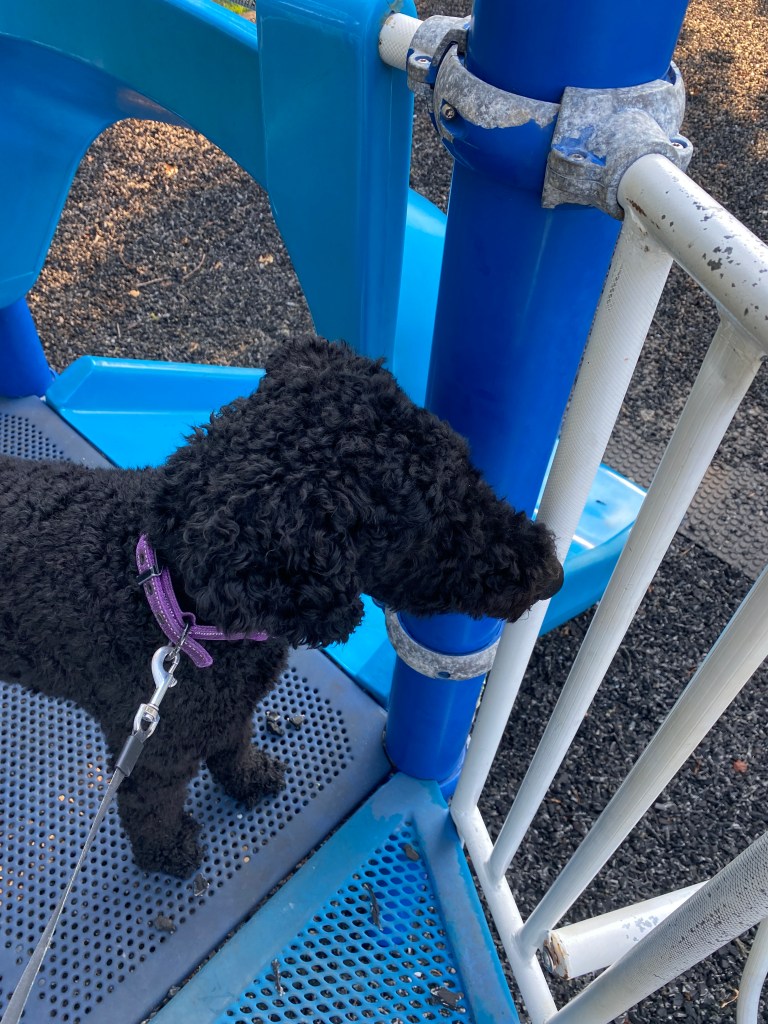 This is me deciding not to go down the sliding board this morning at the Park. But I did remind Kiki how smart I am. When we went outside I started on our usual walk path and Kiki said, “No, we are taking Ping.” And I went right over and sat down outside Ping’s garage door.