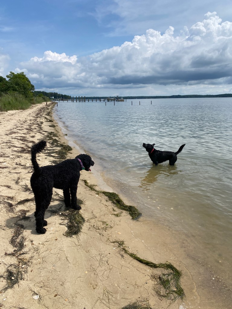 Today I got to ride in the car three times. First, Ping, Kiki, and I went to Belle Isle for a nice walk around the campground. Then, after Kiki went out on her SUP, we got back in Ping and had a play date with Rikki. This is a picture of Rikki trying to convince me to join her for a swim. I decided to keep my toes dry. But I do love grabbing mouthfuls of sea grass and throwing it up in the air.