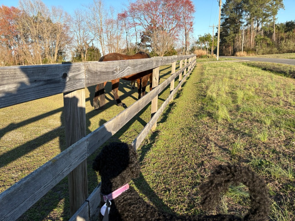 For our long evening walk Kiki took me to see my horse friends. Unfortunately she is a slow photographer and missed the photo of me touching noses with the pony. It really happened!